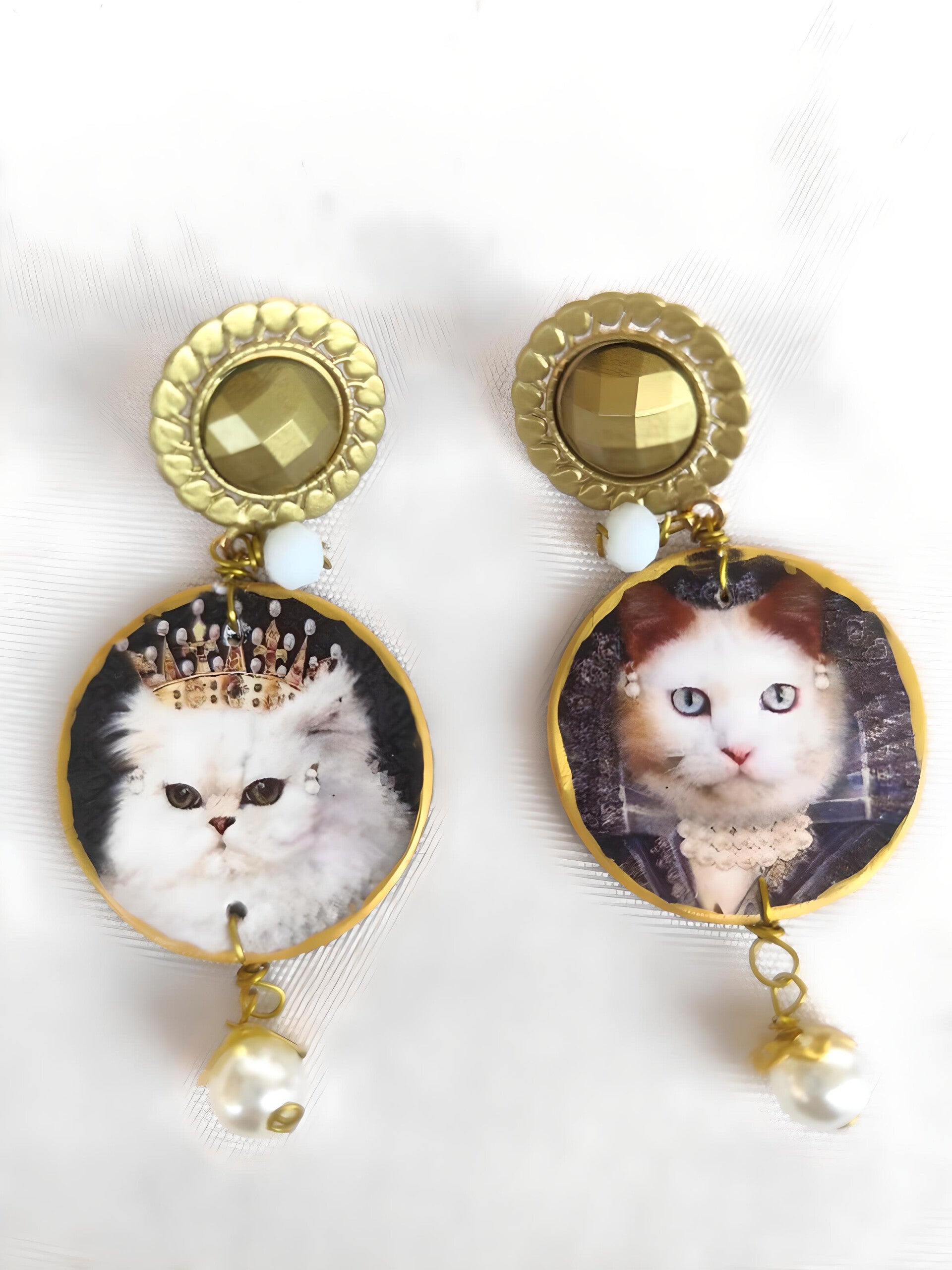 - Each earring features an engraved and hand-glued painting of a regal Cat King and a majestic Cat Queen, complete with tiny crowns, whiskers and playful expressions. Crafted with attention to detail, these earrings are sure to make a statement.