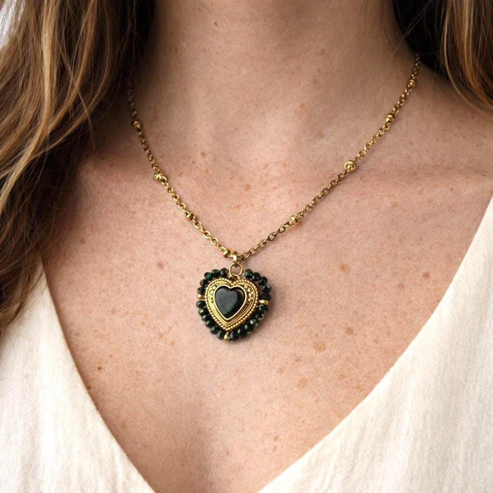 The design features a fine gold chain with small decorative details interspersed throughout, adding texture and sophistication. The absolute centerpiece is the richly ornamented heart-shaped pendant (approx. 2.5 cm). At its heart stands a black heart with a vitreous finish and profound shine, symbolizing passion and devotion. This central heart is framed by a gold-plated structure crafted with ornamental relief, inspired by antique and religious motifs.