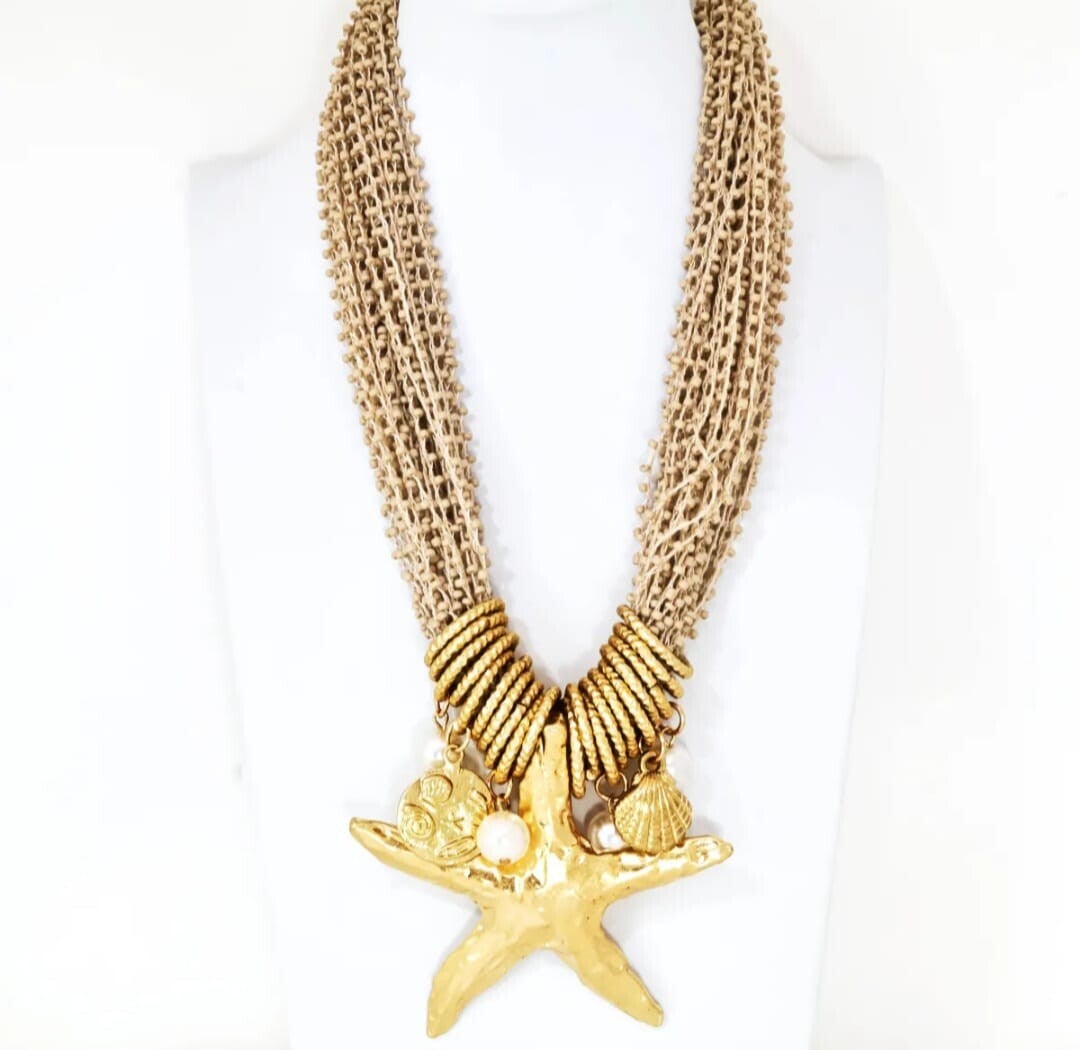 A striking gold-plated steel starfish takes center stage, accompanied by small marine charms such as shells and decorative pearls that reinforce its coastal inspiration.