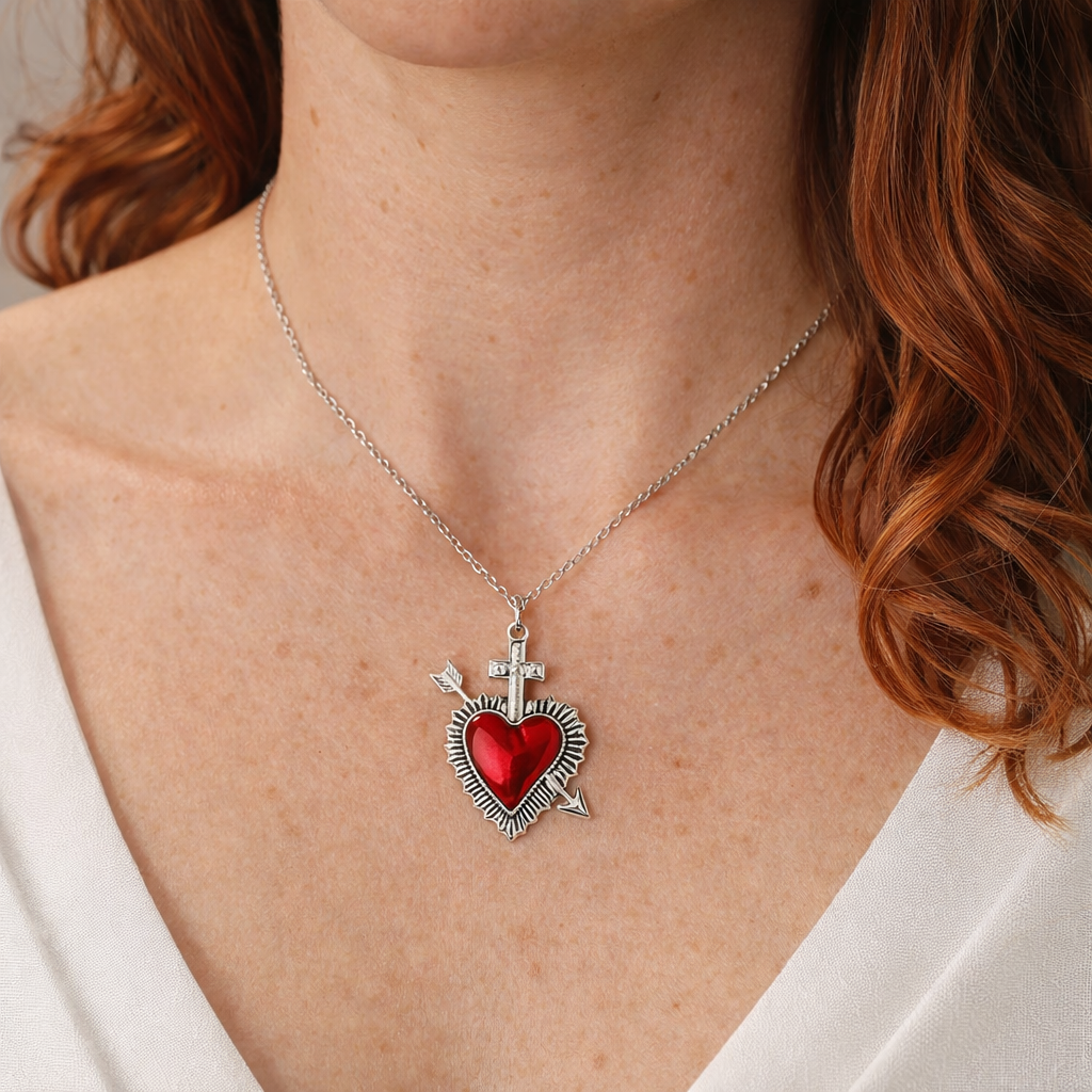 It works beautifully as a statement piece over low-cut necklines or white dresses, as the red of the heart stands out dramatically against neutral tones.