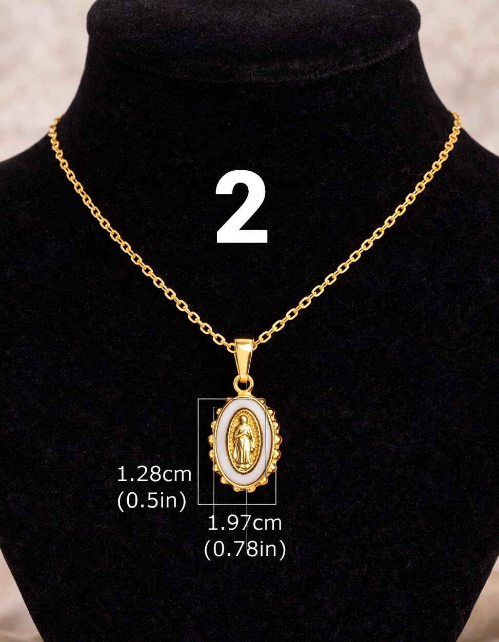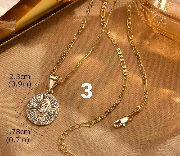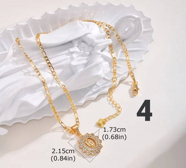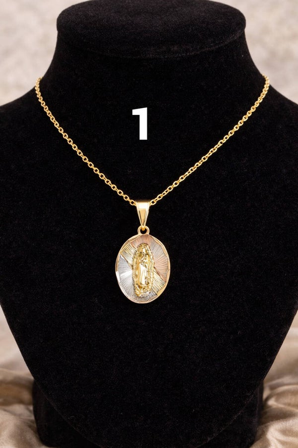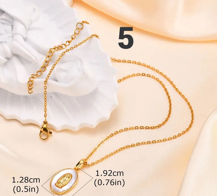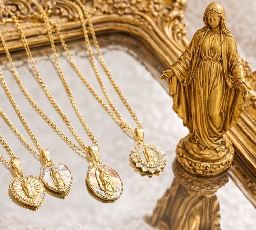 The necklaces pictured feature an elegant and symbolic design inspired by devotion to the Virgin Mary. Each piece stands out for its delicate and luminous style, ideal for both everyday wear and special occasions.